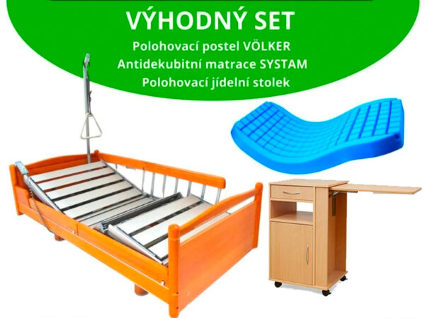 Potřebujete kompletní výbavu? Využijte výhodného setu a získejte elektrickou polohovací postel VÖLKER, antidekubitní matraci SYSTAM s potahem a dřevěný polohovatelný stolek za výhodnou cenu!
